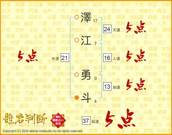 澤(17画)江(7画) 勇(9画)斗(4画)