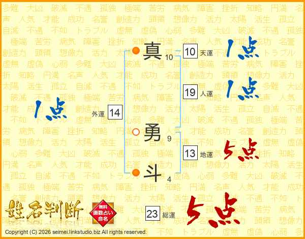 生活面を象徴する運勢です。外部から受ける影響力を表し、結婚運、家庭運や職場、環境への順応性を表します。総運から人運を引いた画数。姓や名が1文字の場合を除く。