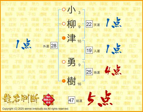 小(3画)柳(9画)津(10画) 勇(9画)樹(16画)