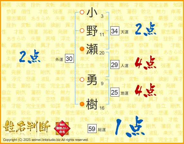 小(3画)野(11画)瀬(20画) 勇(9画)樹(16画)