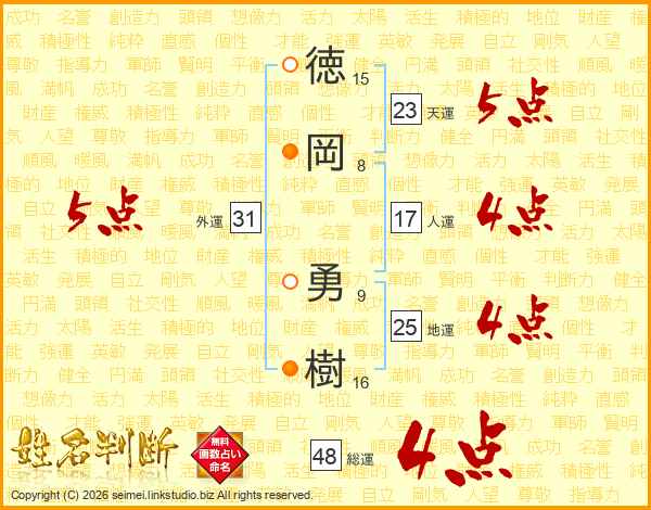 徳(15画)岡(8画) 勇(9画)樹(16画)