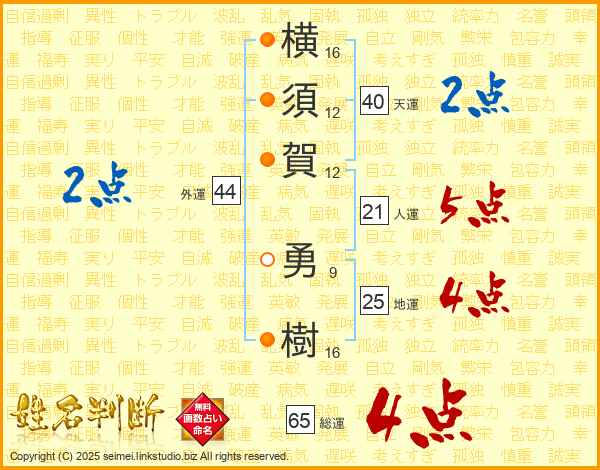 横(16画)須(12画)賀(12画) 勇(9画)樹(16画)