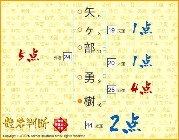 矢(5画)ヶ(3画)部(11画) 勇(9画)樹(16画)