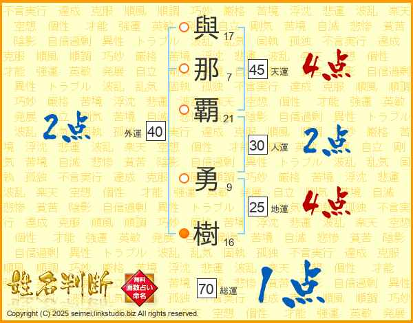 與(17画)那(7画)覇(21画) 勇(9画)樹(16画)