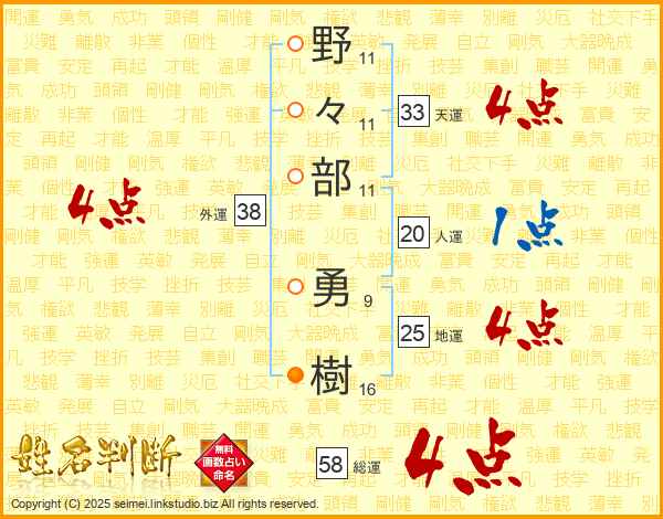 野(11画)々(11画)部(11画) 勇(9画)樹(16画)