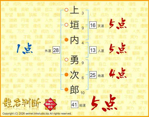 上(3画)垣(9画)内(4画) 勇(9画)次(6画)郎(10画)
