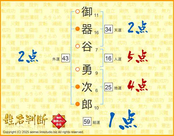 御(11画)器(16画)谷(7画) 勇(9画)次(6画)郎(10画)