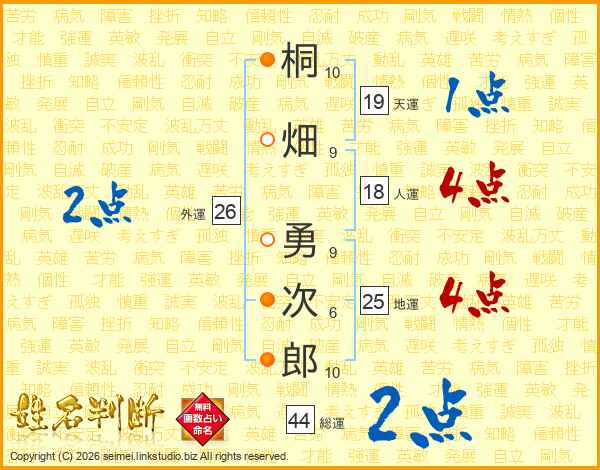桐(10画)畑(9画) 勇(9画)次(6画)郎(10画)