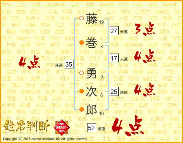 藤(19画)巻(8画) 勇(9画)次(6画)郎(10画)