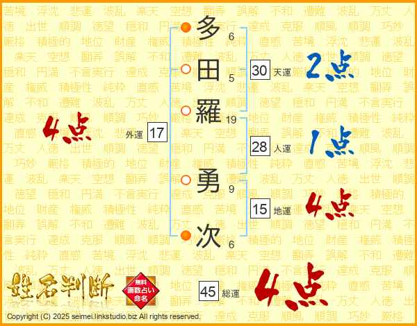 多(6画)田(5画)羅(19画) 勇(9画)次(6画)