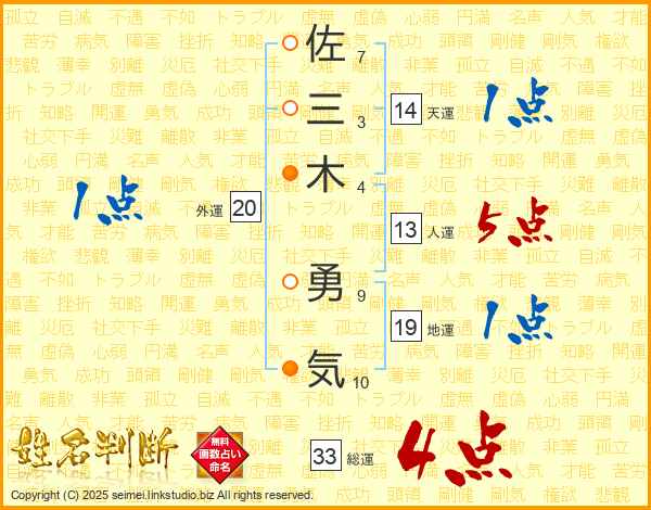 佐(7画)三(3画)木(4画) 勇(9画)気(10画)