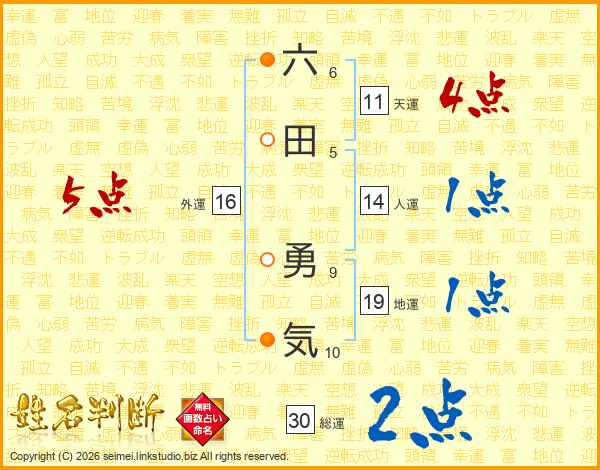 生活面を象徴する運勢です。外部から受ける影響力を表し、結婚運、家庭運や職場、環境への順応性を表します。総運から人運を引いた画数。姓や名が1文字の場合を除く。