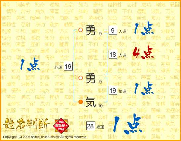 生活面を象徴する運勢です。外部から受ける影響力を表し、結婚運、家庭運や職場、環境への順応性を表します。総運から人運を引いた画数。姓や名が1文字の場合を除く。