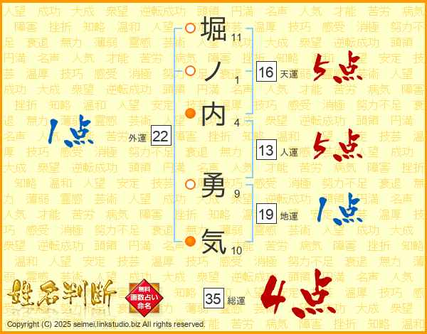 堀(11画)ノ(1画)内(4画) 勇(9画)気(10画)