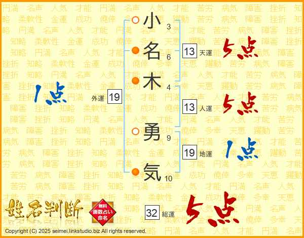 小(3画)名(6画)木(4画) 勇(9画)気(10画)