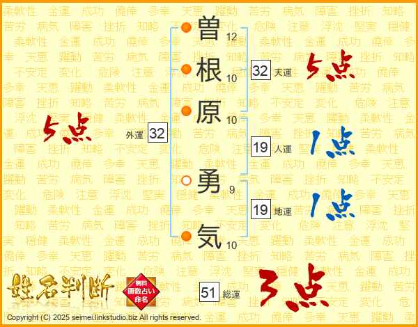 曽(12画)根(10画)原(10画) 勇(9画)気(10画)