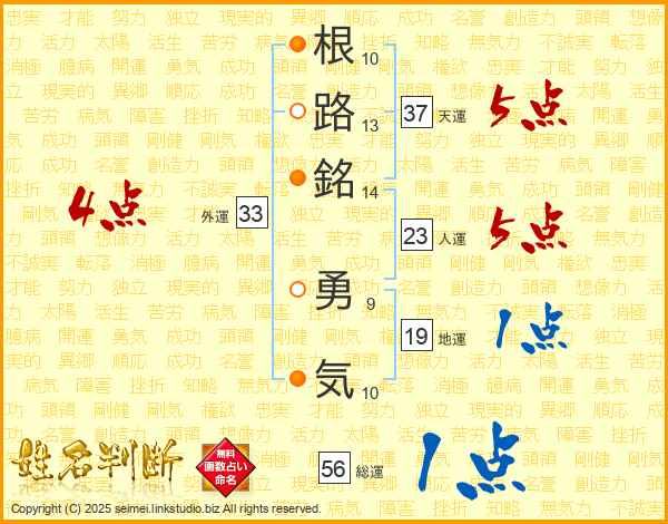 根(10画)路(13画)銘(14画) 勇(9画)気(10画)