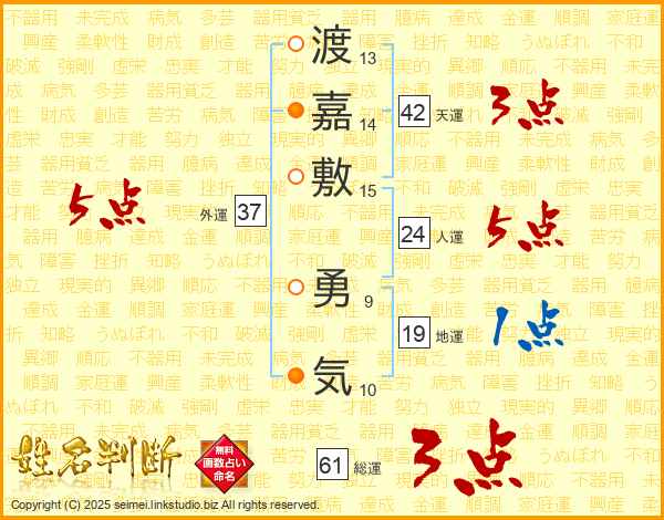 渡(13画)嘉(14画)敷(15画) 勇(9画)気(10画)