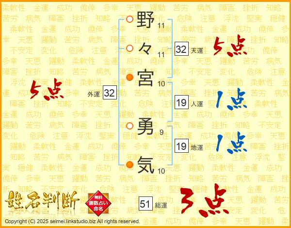 野(11画)々(11画)宮(10画) 勇(9画)気(10画)