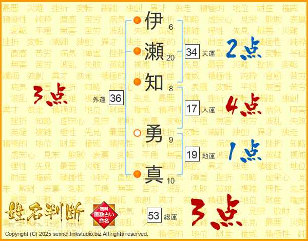 伊(6画)瀬(20画)知(8画) 勇(9画)真(10画)