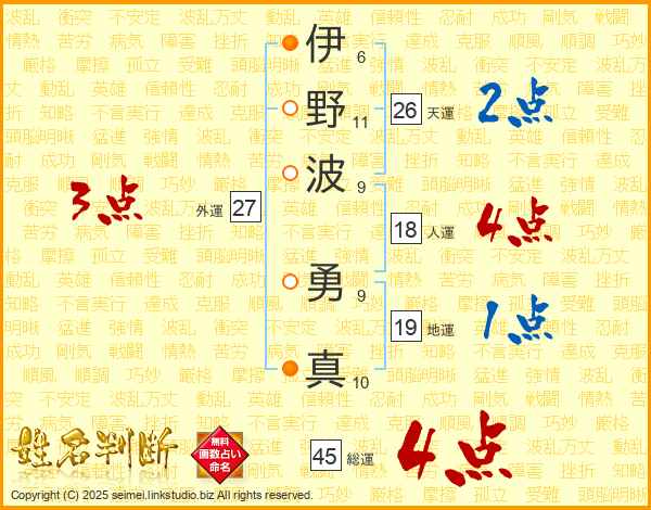 伊(6画)野(11画)波(9画) 勇(9画)真(10画)