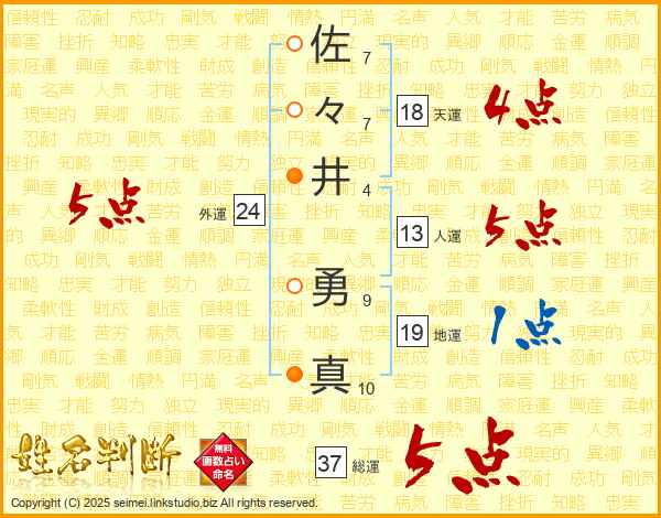 佐(7画)々(7画)井(4画) 勇(9画)真(10画)