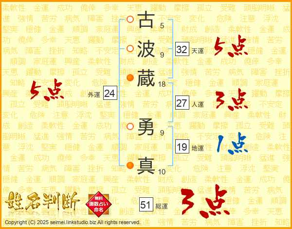 古(5画)波(9画)蔵(18画) 勇(9画)真(10画)