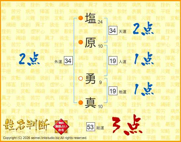 塩(24画)原(10画) 勇(9画)真(10画)