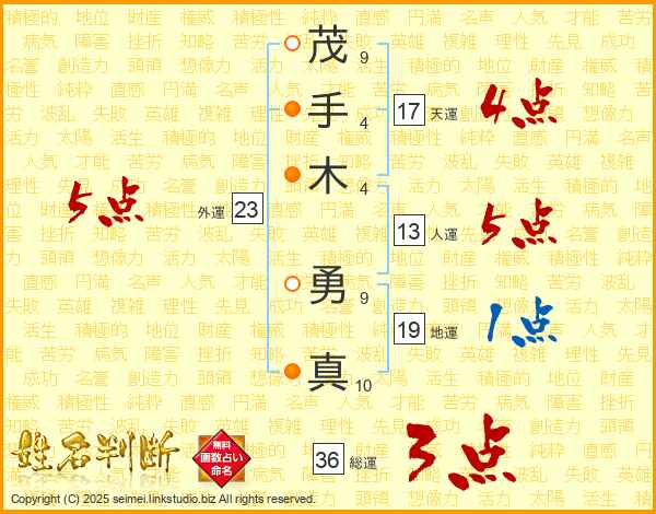 茂(9画)手(4画)木(4画) 勇(9画)真(10画)