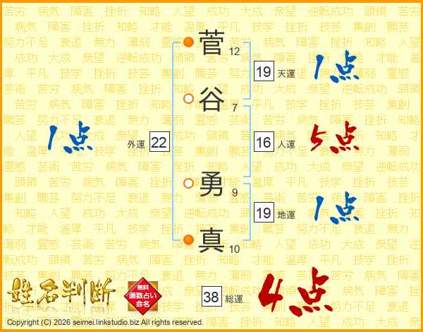 菅(12画)谷(7画) 勇(9画)真(10画)