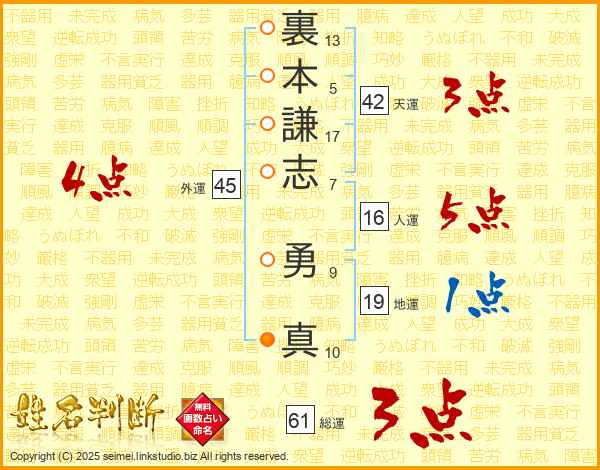 裏(13画)本(5画)謙(17画)志(7画) 勇(9画)真(10画)