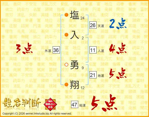 塩(24画)入(2画) 勇(9画)翔(12画)