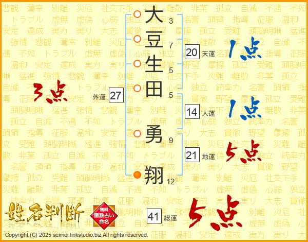 大豆生田勇翔さんの地運は21画の5点!