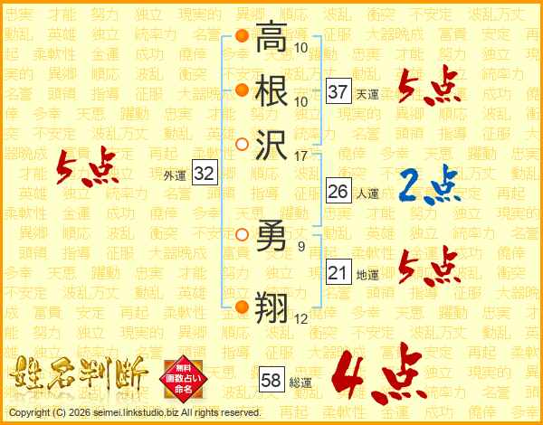 高根沢勇翔さんの総運は58画の4点!
