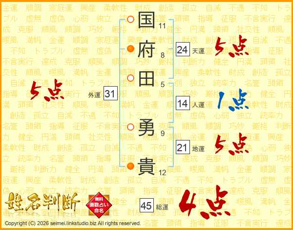 国(11画)府(8画)田(5画) 勇(9画)貴(12画)