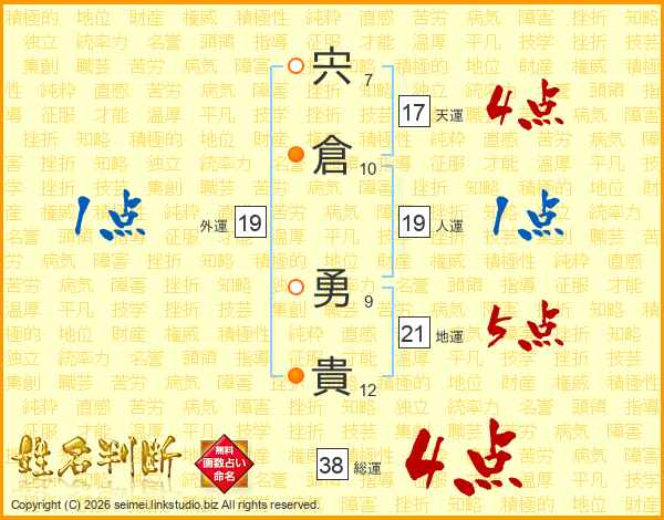 宍(7画)倉(10画) 勇(9画)貴(12画)
