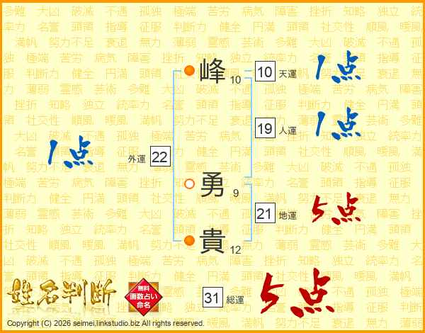 峰(10画) 勇(9画)貴(12画)