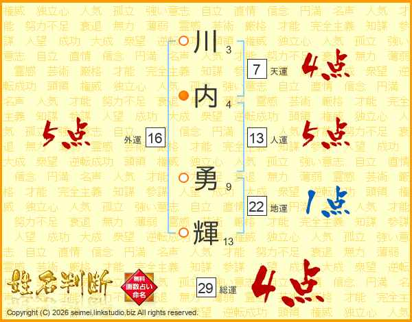 川(3画)内(4画) 勇(9画)輝(13画)