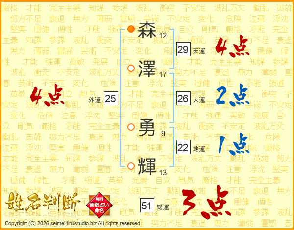 森澤勇輝さんの人運は26画の2点!