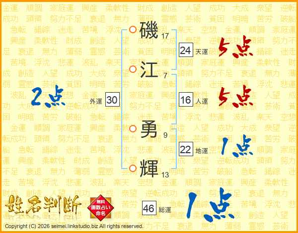 磯(17画)江(7画) 勇(9画)輝(13画)