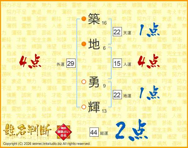 あなたの人生を表す1番重要な運勢です。生涯を通じて影響する総合運となり、主に50歳以降の晩年期に影響を及ぼします。苗字と名前の合計画数。