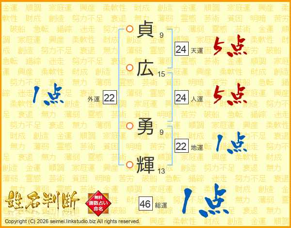 貞(9画)広(15画) 勇(9画)輝(13画)