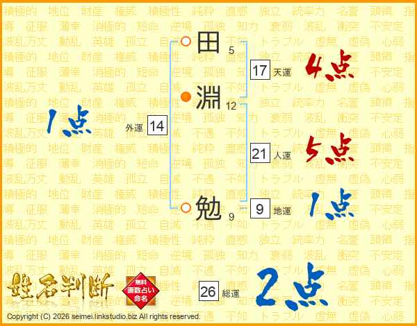 生活面を象徴する運勢です。外部から受ける影響力を表し、結婚運、家庭運や職場、環境への順応性を表します。総運から人運を引いた画数。姓や名が1文字の場合を除く。