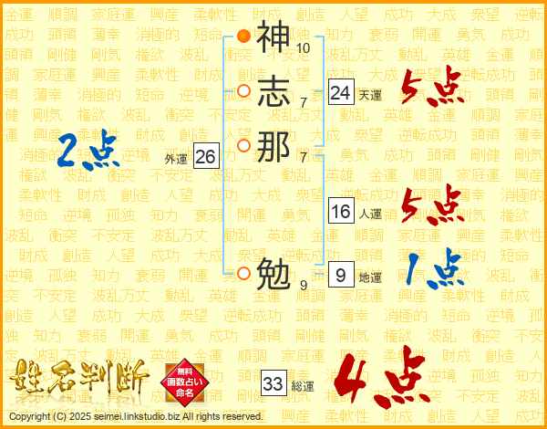 生活面を象徴する運勢です。外部から受ける影響力を表し、結婚運、家庭運や職場、環境への順応性を表します。総運から人運を引いた画数。姓や名が1文字の場合を除く。