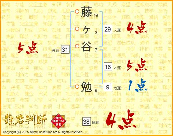 藤(19画)ヶ(3画)谷(7画) 勉(9画)