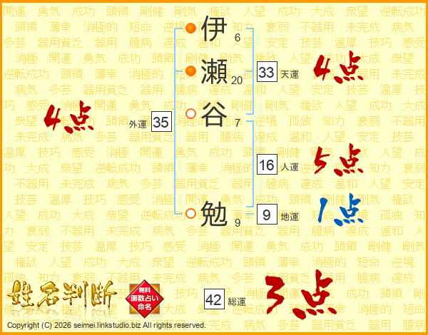 伊(6画)瀬(20画)谷(7画) 勉(9画)