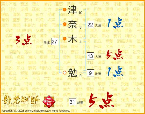 津奈木勉さんの総運は31画の5点!