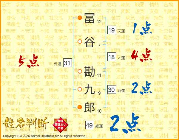 冨(12画)谷(7画) 勘(11画)九(9画)郎(10画)
