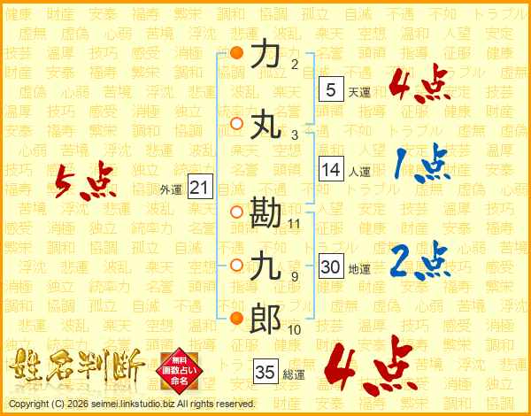 力(2画)丸(3画) 勘(11画)九(9画)郎(10画)