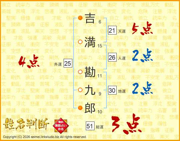 吉(6画)満(15画) 勘(11画)九(9画)郎(10画)